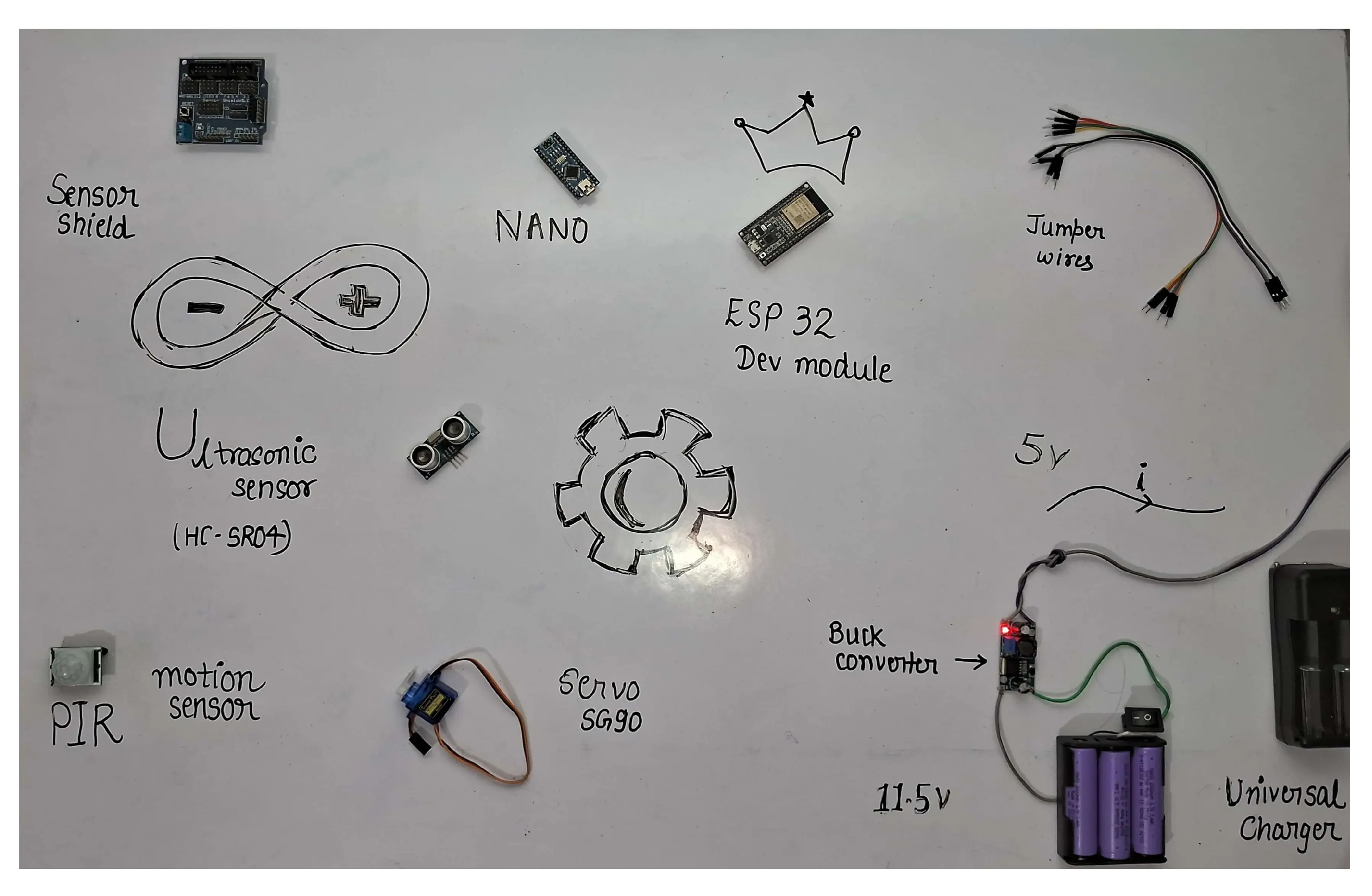 Initial power supply using 9V batteries proved insufficient. The final solution involved: